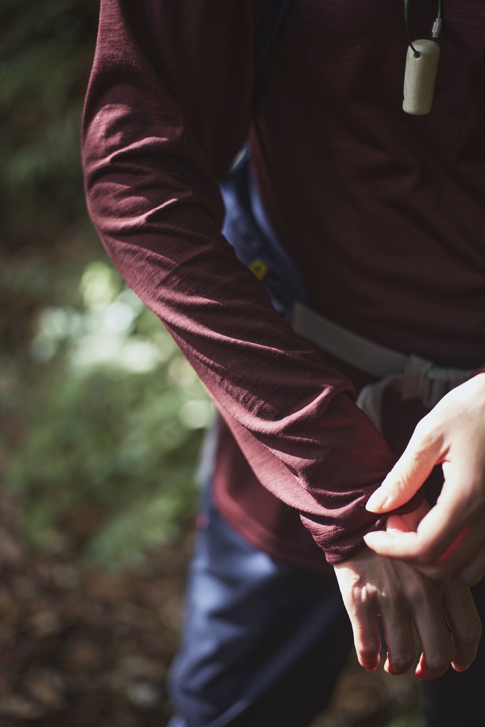 「メリノウールって肌触りも機能も、穏やかで優しい感じがありますよ。山で良さを知ってからは、日常的にも身につけるようになりました。普段着としてはコットンを着ることも多いのですが、今日は汗をかきそうだな、と感じる日にはメリノウールを選ぶことが多いです。着替えをそんなに持って行けない旅先での必需品でもあります。コットンに比べると乾きが圧倒的に早いですね。旅先で手洗いして干しておけば、翌朝には乾いていますから」