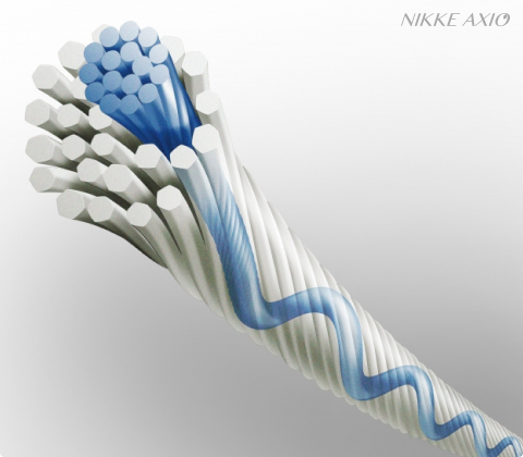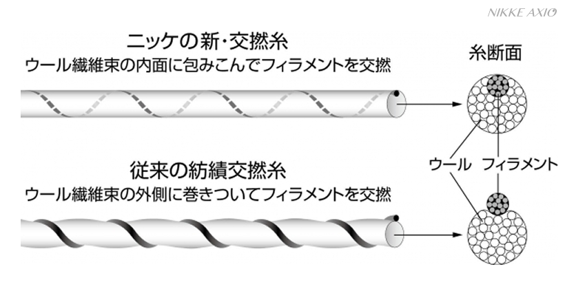 NIKKE AXIO ®は、ウールの繊維束の内側にポリエステルのフィラメントを包み込み、綺麗な流れを描くように交撚している。この高い技術によって、表面はウールのソフトな風合いを最大限に活かし、ポリエステルの機能を内に秘める。